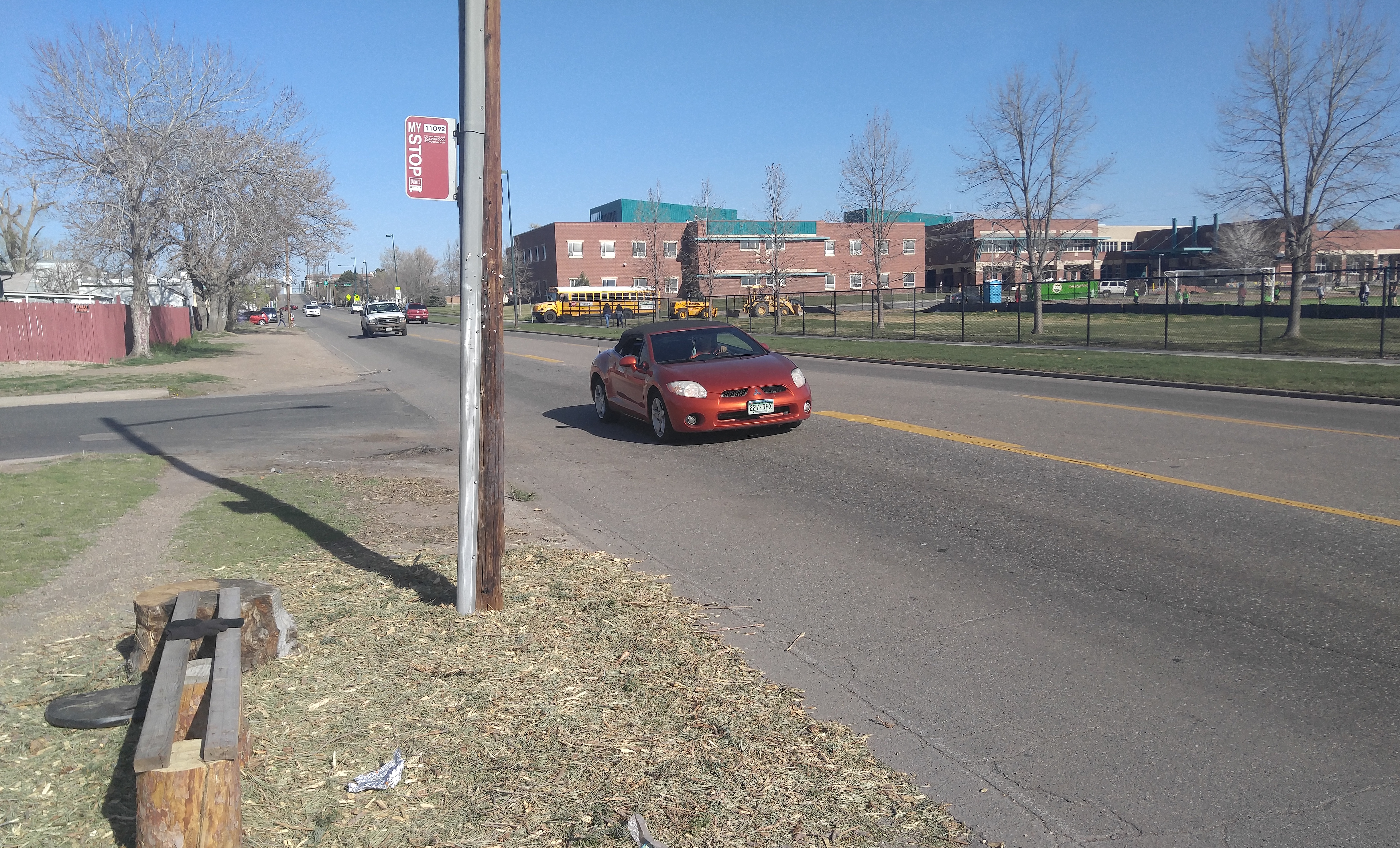 It’s a sad bus stop at 40th and Fillmore in Elyria Swansea, across the street from Bruce Randolph School, on a side of the road with no sidewalks. Happy Walk to School Day, kids!