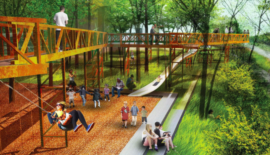 Among other things, the project would give people a safe path to walk above the banks of the South Platte River, dotted along the way with places to sit, gather, and play. It would also slim Arkins Court down to a 22-foot-wide street designed for calmer traffic and safer pedestrian crossings.