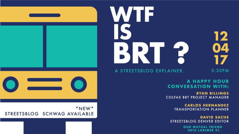 BRT is a new thing for Denver, so Streetsblog wants to help demystify it during a casual, open conversation with experts – and with you. Ryan Billings, the Colfax BRT project manager, will be on hand. So will Carlos Hernandez, a transportation planner who has worked on several local projects, including the Broadway redesign. I’ll be there to ask and answer questions as well.