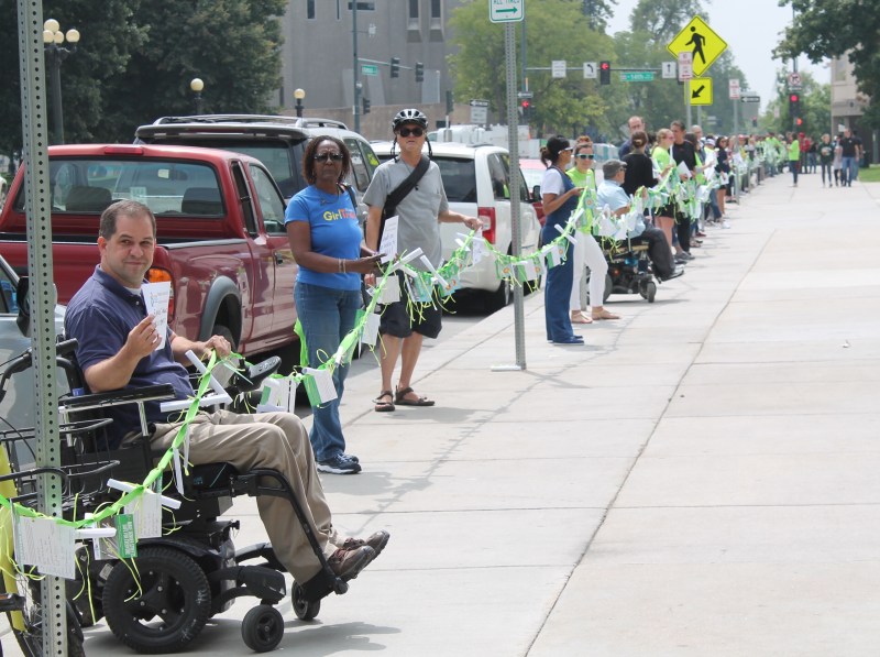 The Denver Streets Partnership organized the mass meeting, where residents held up more than 600 individually written pleas from the public for safer streets. Strung together, they took up the entire length of Bannock Street in front of the seat of city government.