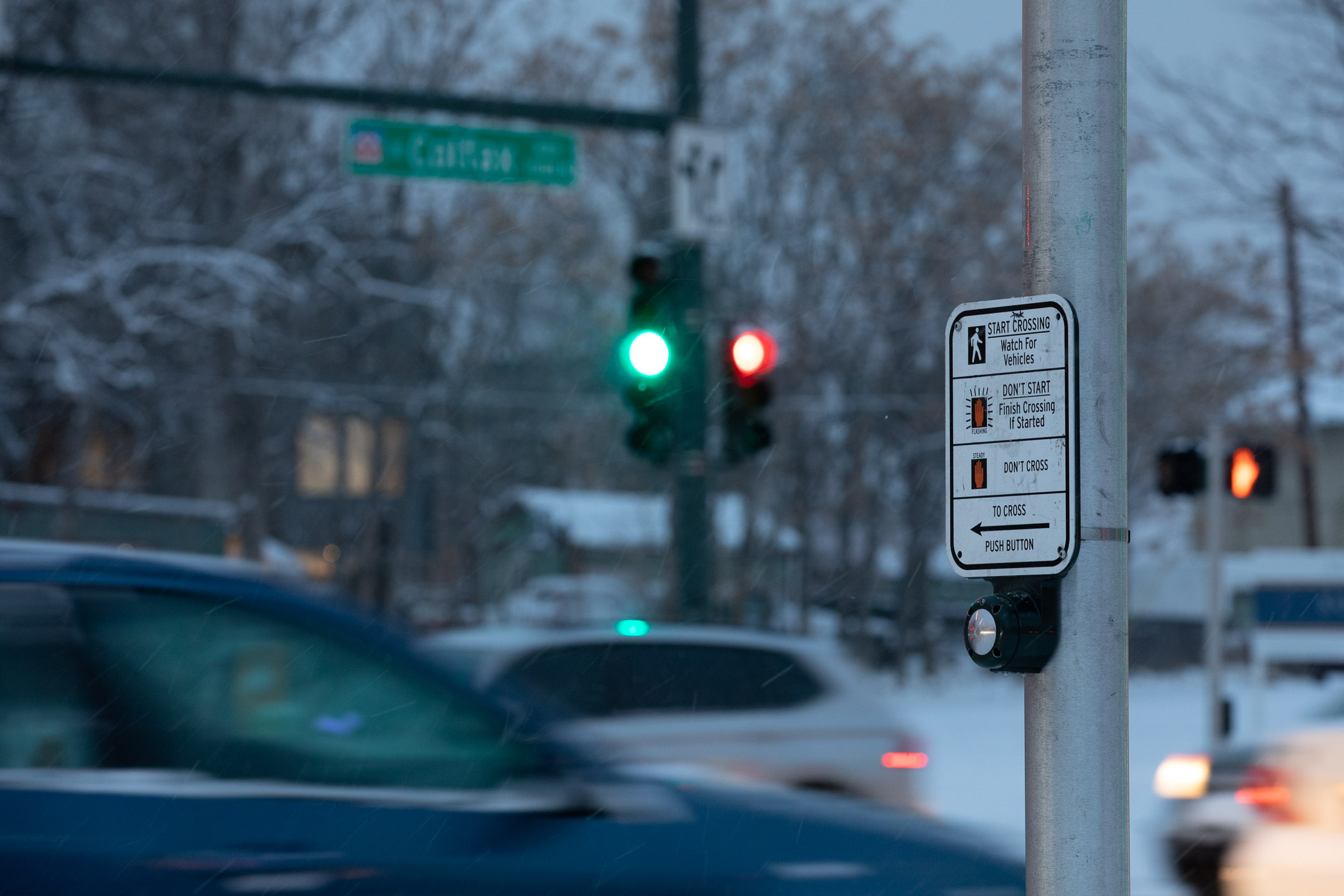 - At the nearest crosswalk, pedestrians must push a “beg button” to trigger a walk signal. If they arrive at the intersection just after a green light, they have to wait for an entire light cycle for a walk signal.