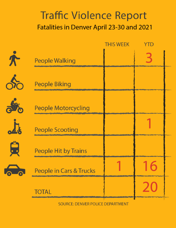 So far in 2021, 20 people have died from traffic violence on Denver streets. Three of the victims were on foot, one was on a scooter, and 16 were in vehicles. At this point in 2020, 15 people were victims of traffic violence in Denver.